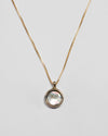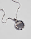 A simple stone disc pendant in custom grey mother of pearl on a classic box chain. Perfect alone or as a layering piece. Bezel set pendant measures 5/8" in diameter, just under 1/8" thick, hand carved and then cast brass or sterling setting.